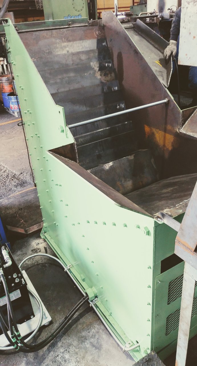 駆動は油圧を採用し、ガイドレールを使用することによりスムーズに動きワークが挟まる問題を解決しました。